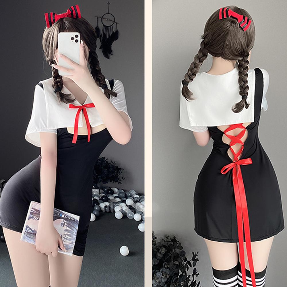 Design: Irresistible School Girl Lingerie Dress featuring two-tone design, short sleeve, sailor lapel neckline with bust hollow out, front red bow decoration and back red lace up, makes you more attractive, shows off body curves.