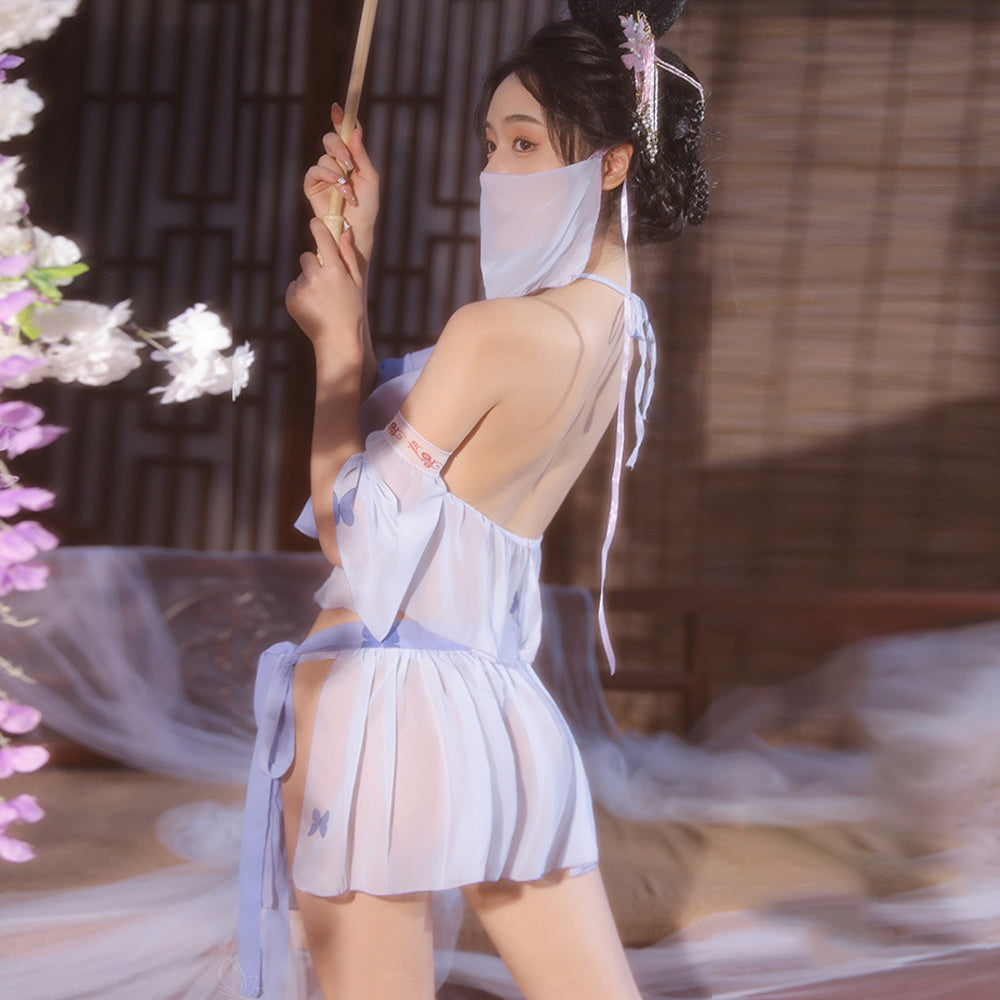 Design:��This��vintage chinese costume��featuring a halter neckline, a strapless top with a tie back closure, sheer chiffon fabric with butterfly printed, a sheer mesh split skirt with a tie closure, and a��matching Irresistible panty.