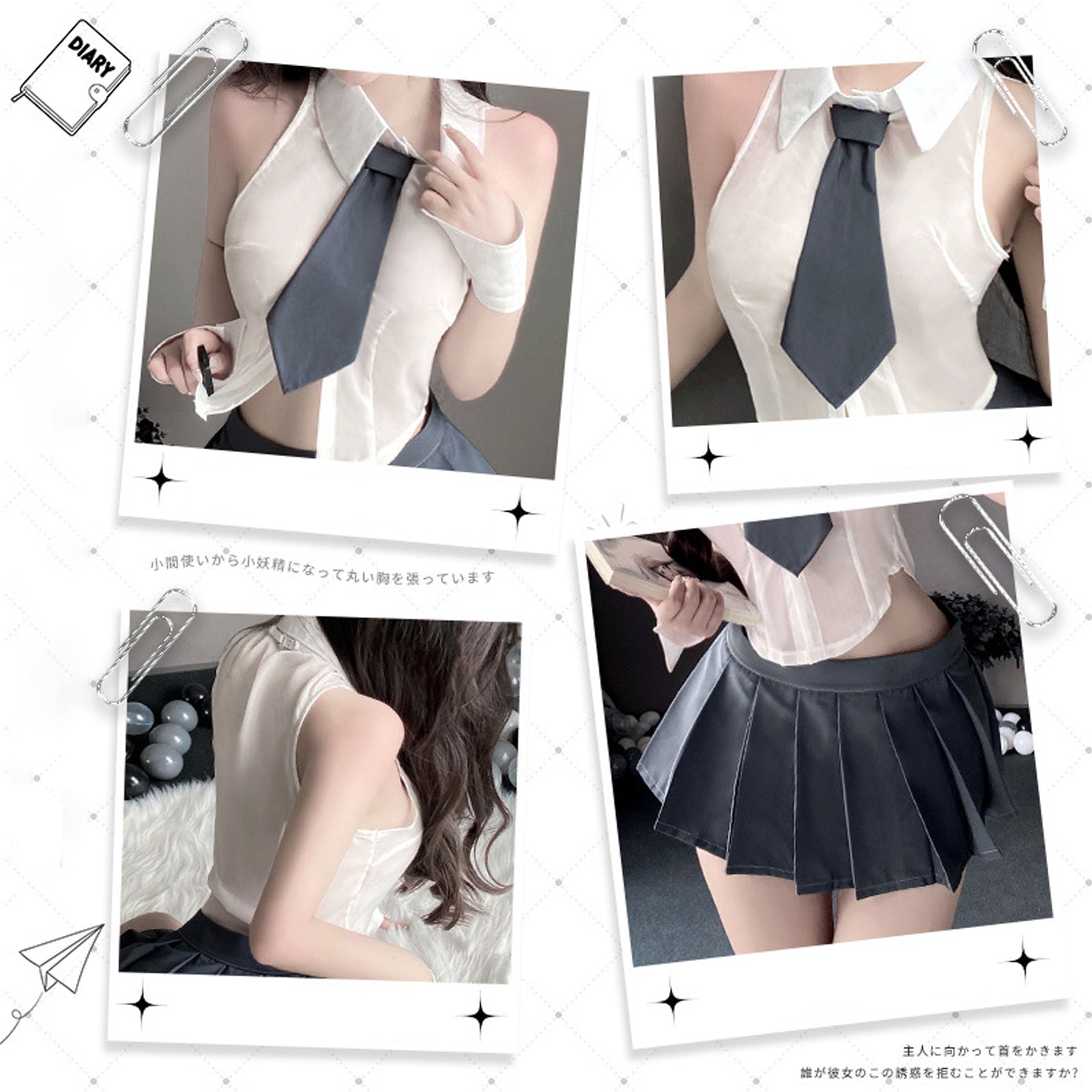Design:��Irresistible��school girl uniform��featuring a white chiffon sleeveless shirt, a front neck tie��accents, for a great cosplay costume look.��Mini pleated skirt will make you Irresistible, cute and attractive.��Fashionable and flirty, this set is designed to make you feel your best and turn heads.��