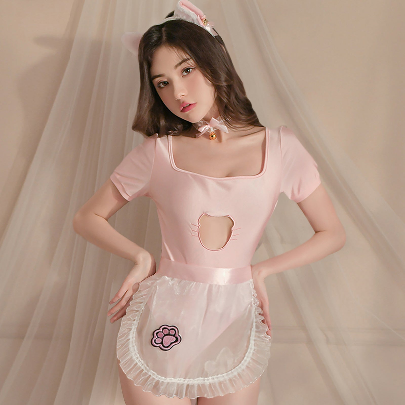 Design:��Irresistible cat girl cosplay costume��featuring a pink bodysuit,��a cut-out bust panel with cat embroidery, a hook and eye open crotch, and matching��organza apron with satin tie closure, cute cat paw accents.