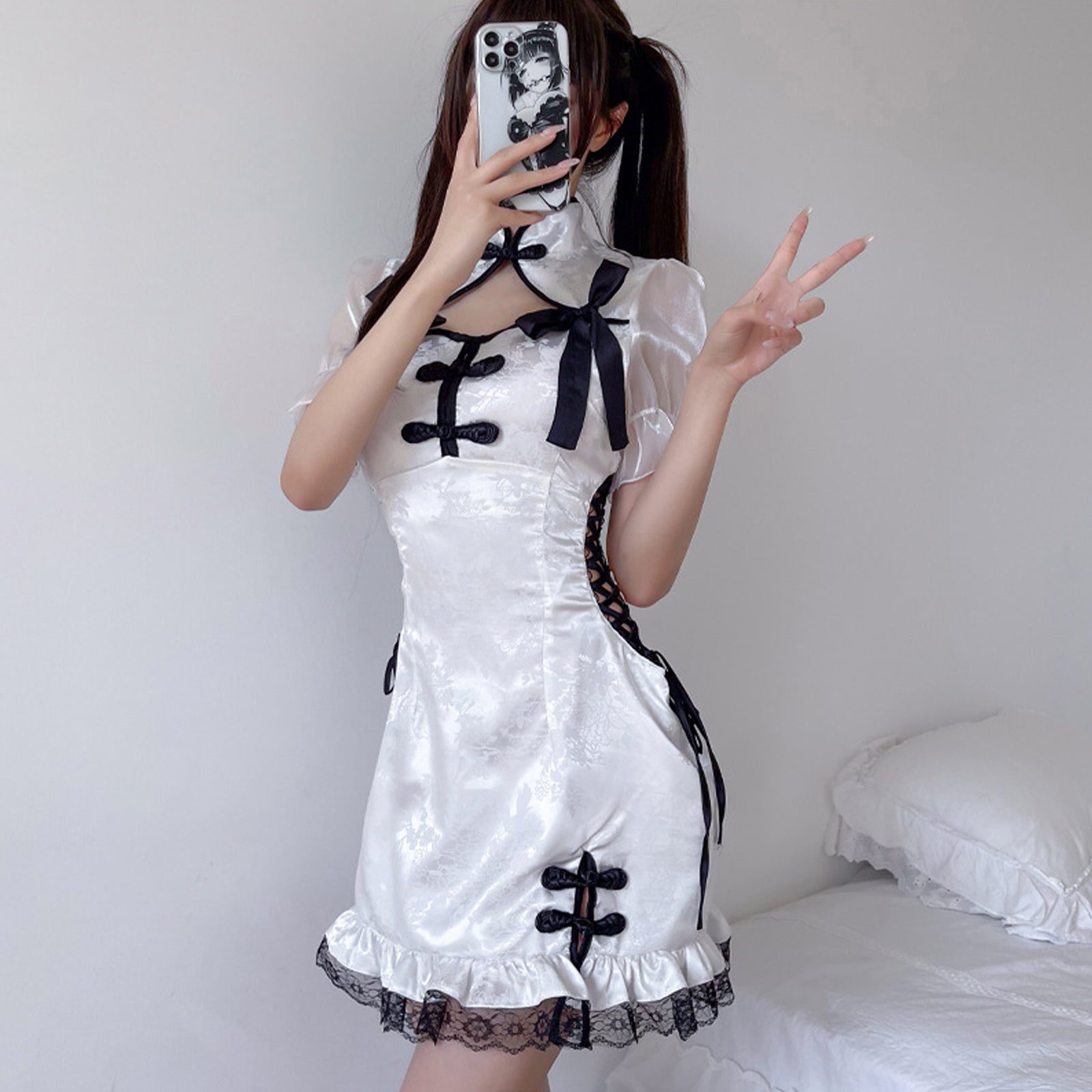 Design:��Amorino Irresistible��Jacquard��Chinese Mini Dress��featurings white cheongsam bodycon dress, classic retro stand collar, traditional chinese buckle with a keyhole, black bow accent, short mesh puff sleeve, back zipper up closure, sides hollow cut lace-up design, the length of the cheongsam can't completely cover the buttocks, which is extremely Irresistible.