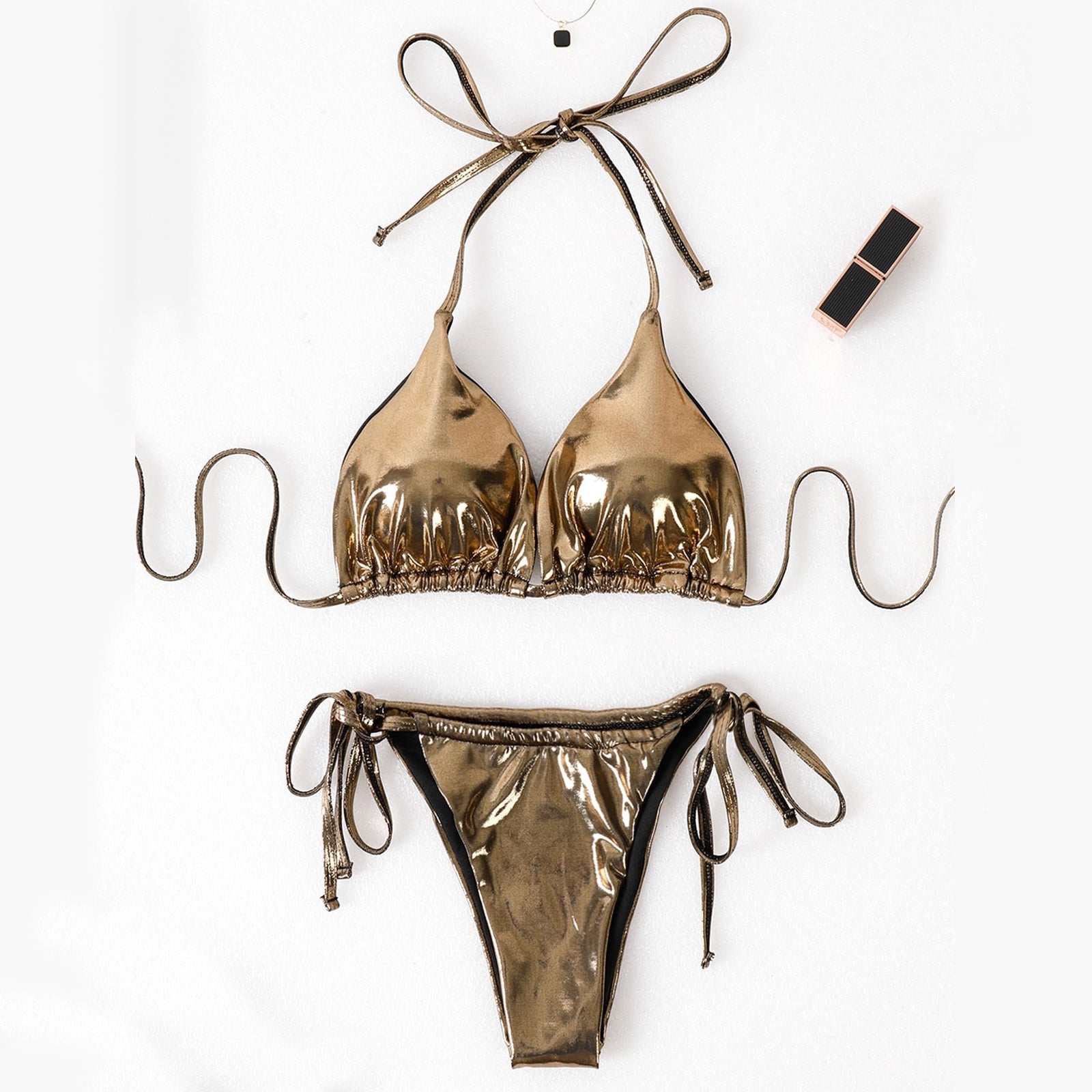 - String halter bikini top - tie closure on the back, Irresistible triangle bikini swimsuits, shiny padded cups