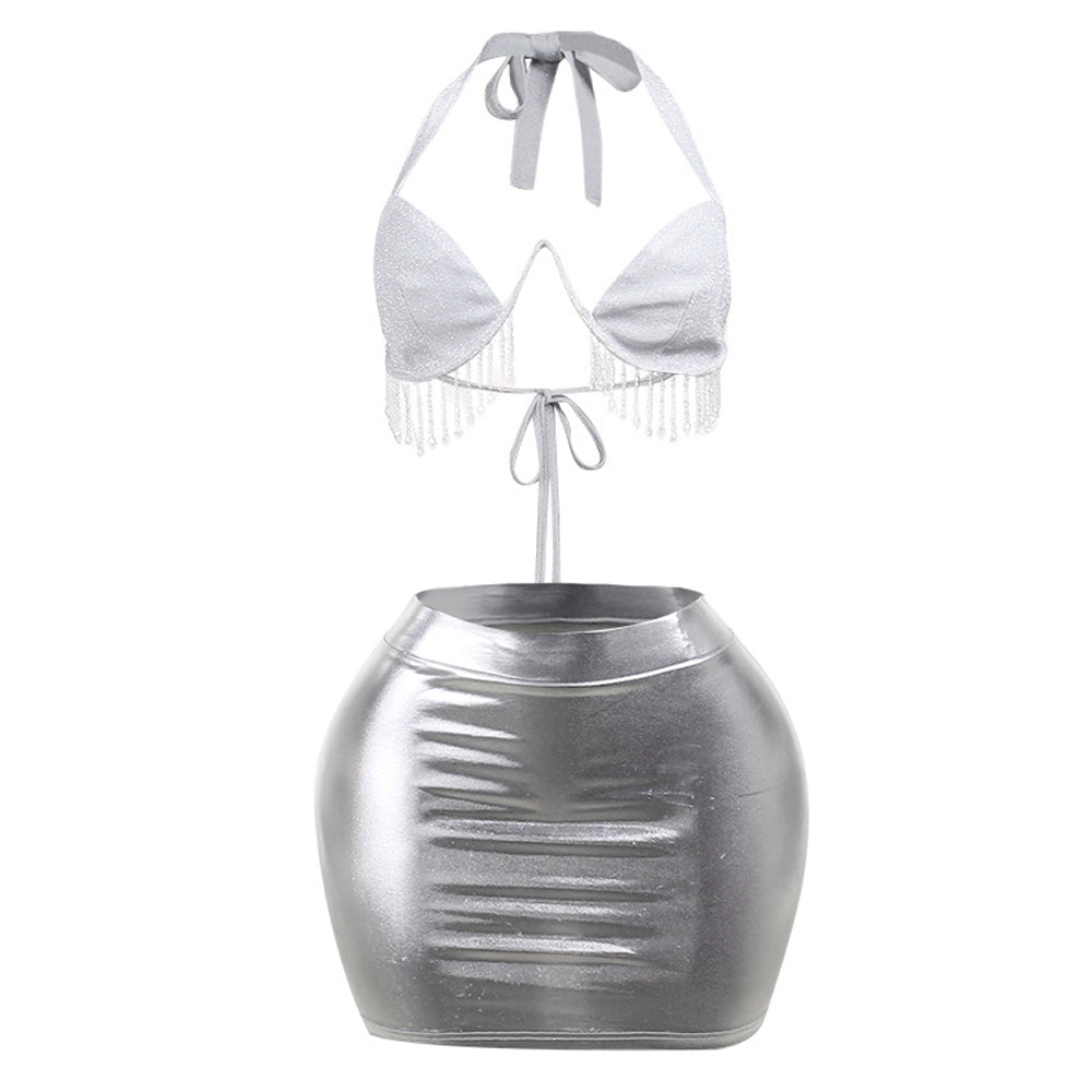 Amorino Metallic Skirt Set: Glamorous Tassel Ensemble