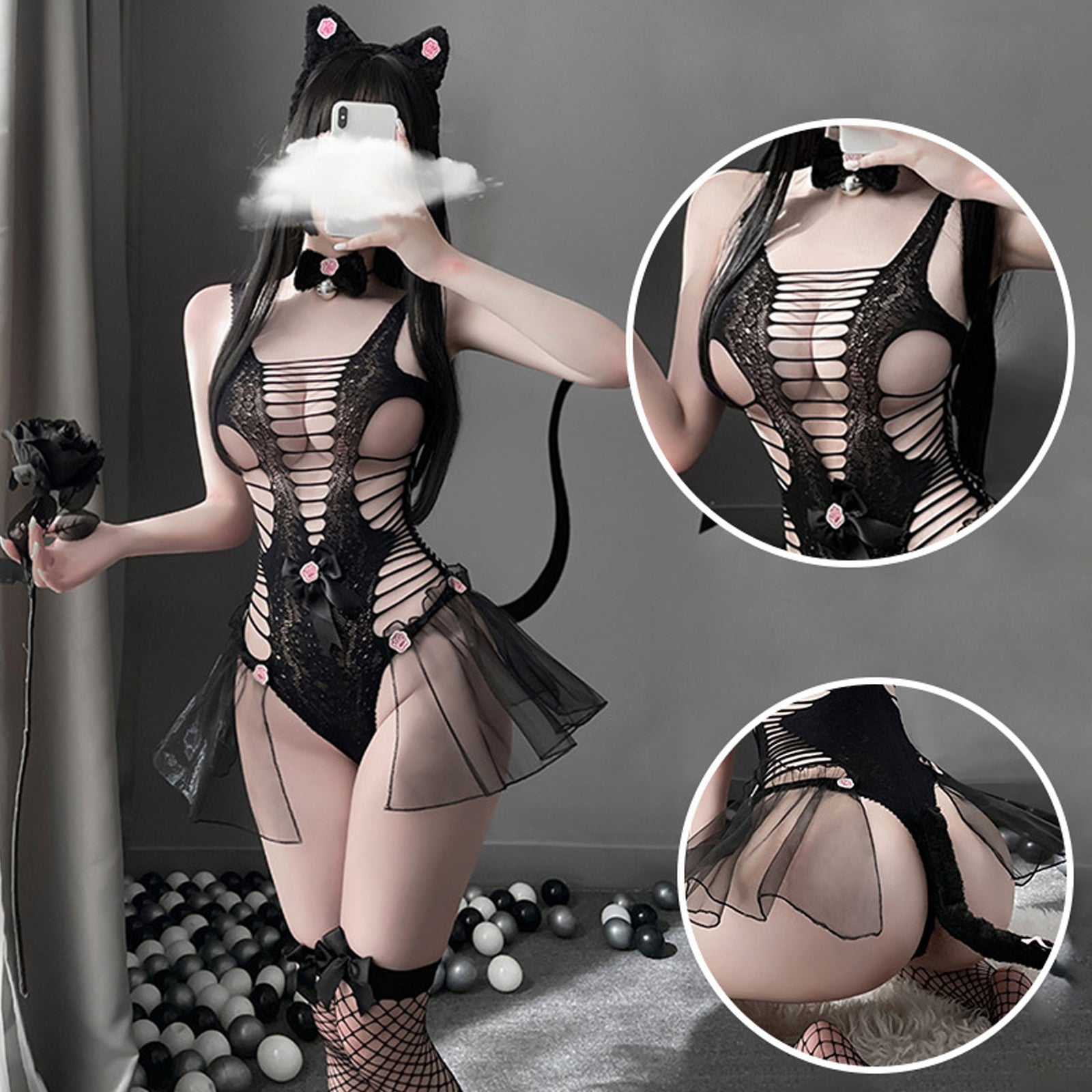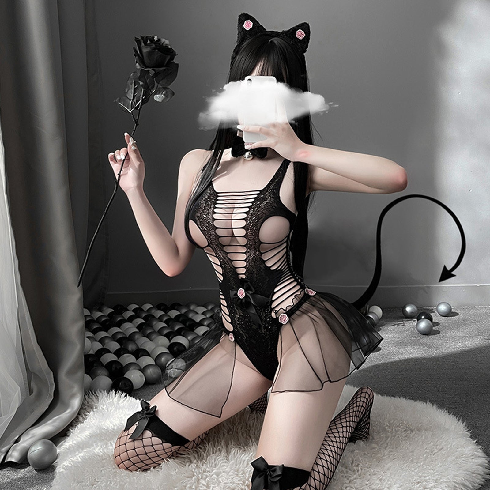 Design:��Cute��japanese kitty costume featuring��black teddy with large-area hollow design, slashed panels, revealing your glossy skin, charming yet Irresistible. The bottom of the bustier top is an opening fluffy short skirt consist and smooth muslin, and removable attached long tail. Elastic spaghetti straps easier to fit your body.