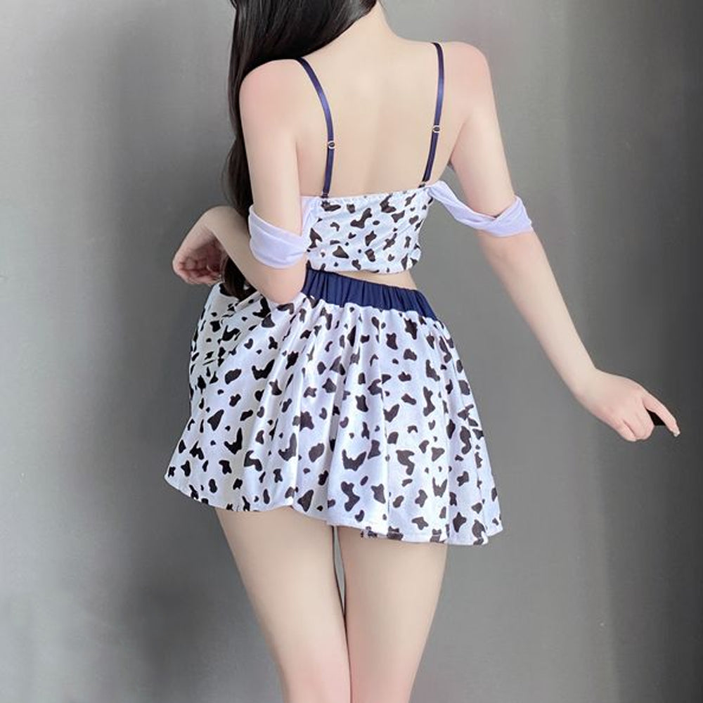 Design:��Anime Cosplay Lingerie Set��featuring a��cow print sleeveless��crop top, adjustable spaghetti straps,��front lace-up design, and a matching��skirt with elastic waitband. Enjoy a irresistible and playful look with eye-catching flair that's sure to turn heads.