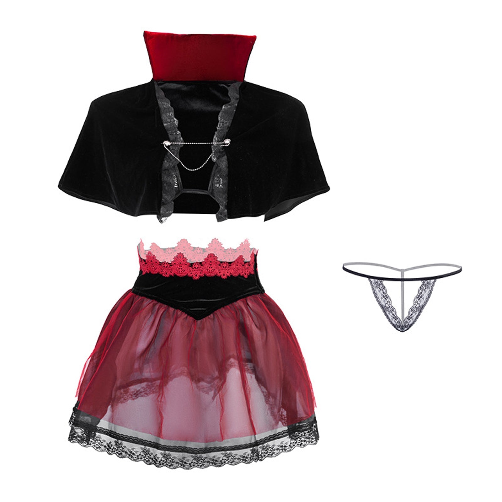 Design:��Amorino Demon Girl Outfit��featuring��velvety black cape with metal��chain clasp and��lace trim, sheer mesh skirt with velcro closure, red guipure lace at waist, and double tiered hem,��provides an alluring and irresistible look.