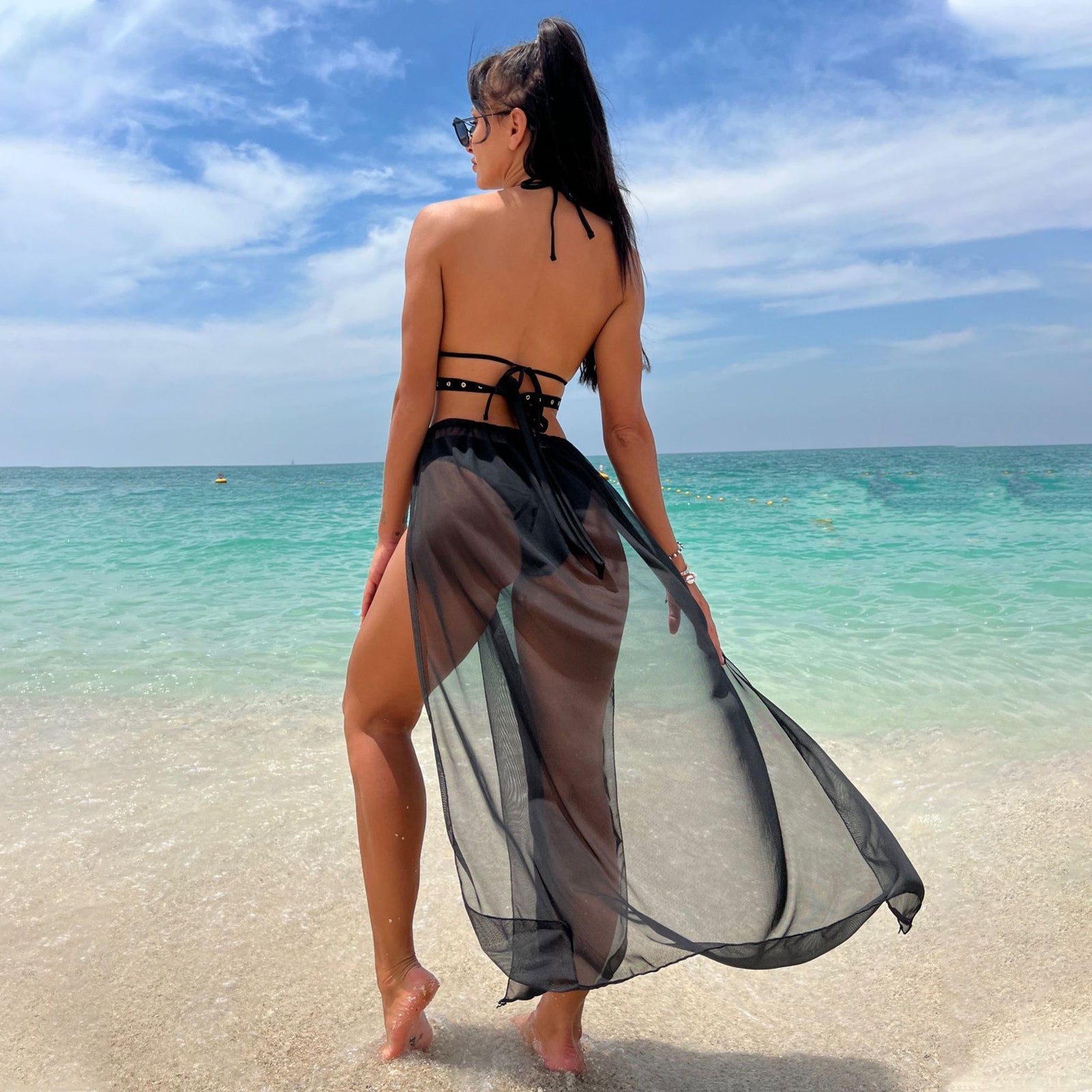 Amorino Women's Black Strappy Bikini Set with Sheer Mesh Cover Up